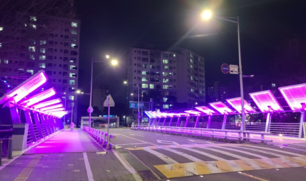 교량 난간 상부에 설치된 대형 패널에 RGB LED를 적용하여 보라색, 주황색, 에메랄드색 등 다양한 색상 연출이 가능하도록 설계되었습니다.