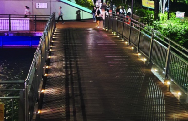 송파구의 대표적인 랜드마크인 석촌호수 산책로에 설치된 수변 데크 및 야간 경관 조명 시공 사례입니다. 난간 하단부를 따라 일정 간격으로 LED 조명을 배치하여, 야간 보행자에게 명확한 보행 가이드라인을 제공함과 동시에 호수 수면에 비치는 아름다운 반영(Reflection) 효과를 연출했습니다. 시야를 가리지 않는 슬림한 디자인의 난간을 채택하여 산책로를 걷는 시민들이 호수 경관을 가로막힘 없이 감상할 수 있도록 배려했습니다.