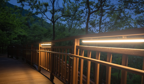 본 구간은 수목이 우거진 곡선형 데크 산책로로, 주간에는 쾌적한 녹지 공간이지만 야간에는 조도가 부족해 이용이 제한되는 환경이었습니다. 이를 개선하기 위해 난간 상부 하단 라인에 슬림형 라인바를 연속 설치하여 보행 동선을 따라 자연스럽게 이어지는 직선 조명을 구현했습니다.