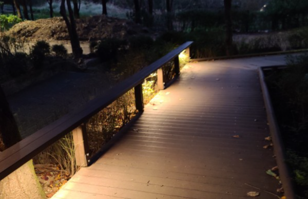 해당 구간은 수목이 울창한 산림형 보행로와 데크, 계단이 혼합된 구조로, 야간에는 조도가 부족하여 이용이 제한되던 공간이었습니다. 이를 개선하기 위해 난간 하부를 따라 라인바 조명을 연속적으로 설치하여 보행 동선을 따라 자연스럽게 이어지는 조명 환경을 구축했습니다.
