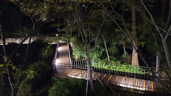 해당 구간은 수목이 우거진 산지형 공원으로, 계단과 데크가 혼합된 구조를 이루고 있어 야간에는 시인성이 떨어지고 보행 안전에 취약한 환경이었습니다. 이를 개선하기 위해 난간 하부를 따라 라인바 조명을 연속적으로 설치하여 보행 동선을 명확히 유도하고 안정적인 조도를 확보했습니다.