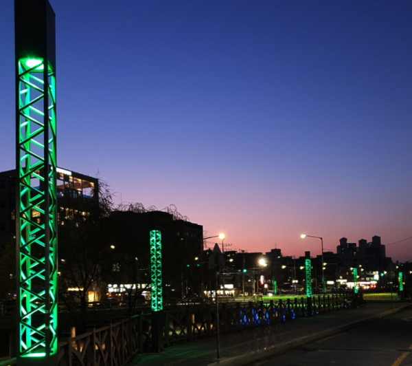 사진에서 보듯 블루, 핑크, 그린 등 다양한 색상으로 변화하며 계절감이나 구청의 행사 테마에 맞춰 역동적인 야간 경관을 선사합니다.