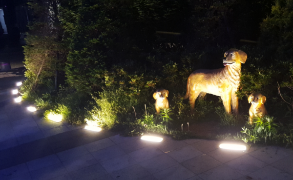화단 앞 강아지 가족 조형물을 하단에서 위로 비추는 업라이팅(Up-lighting) 기법을 사용해, 야간에도 친근하고 입체적인 경관을 연출했습니다.
