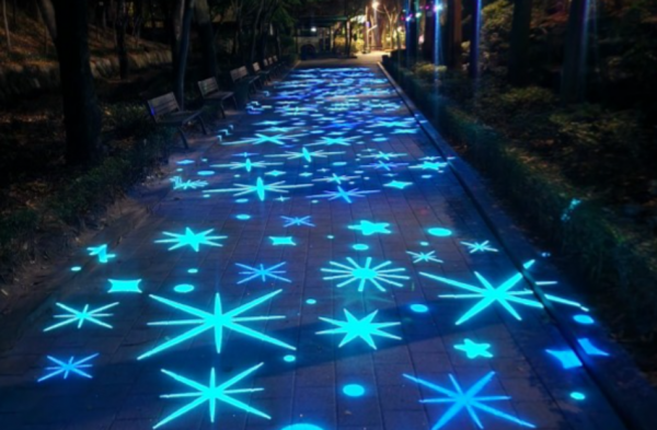 환상적인 은하수와 별빛 산책로   산책로 바닥에 푸른색 계열의 별과 성단 모양의 고보조명을 투사했습니다.  마치 밤하늘의 은하수를 지상으로 옮겨놓은 듯한 연출로, 길을 걷는 것만으로도 동화 속에 들어온 듯한 신비로운 느낌을 줍니다.   화사한 장미와 클로버 패턴을 사용하여 삭막할 수 있는 보도블록 위에 생동감을 불어넣었습니다.  고보조명 특유의 선명한 색감 덕분에 실제 꽃밭을 걷는 듯한 기분을 느낄 수 있어, 방문객들에게 인기 있는 포토존이 되었습니다.